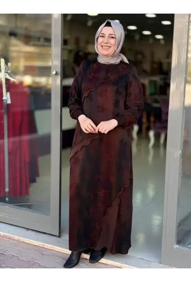 DEFRİNA DALGALI DESENLİ CUPRO ELBİSE Bordo
