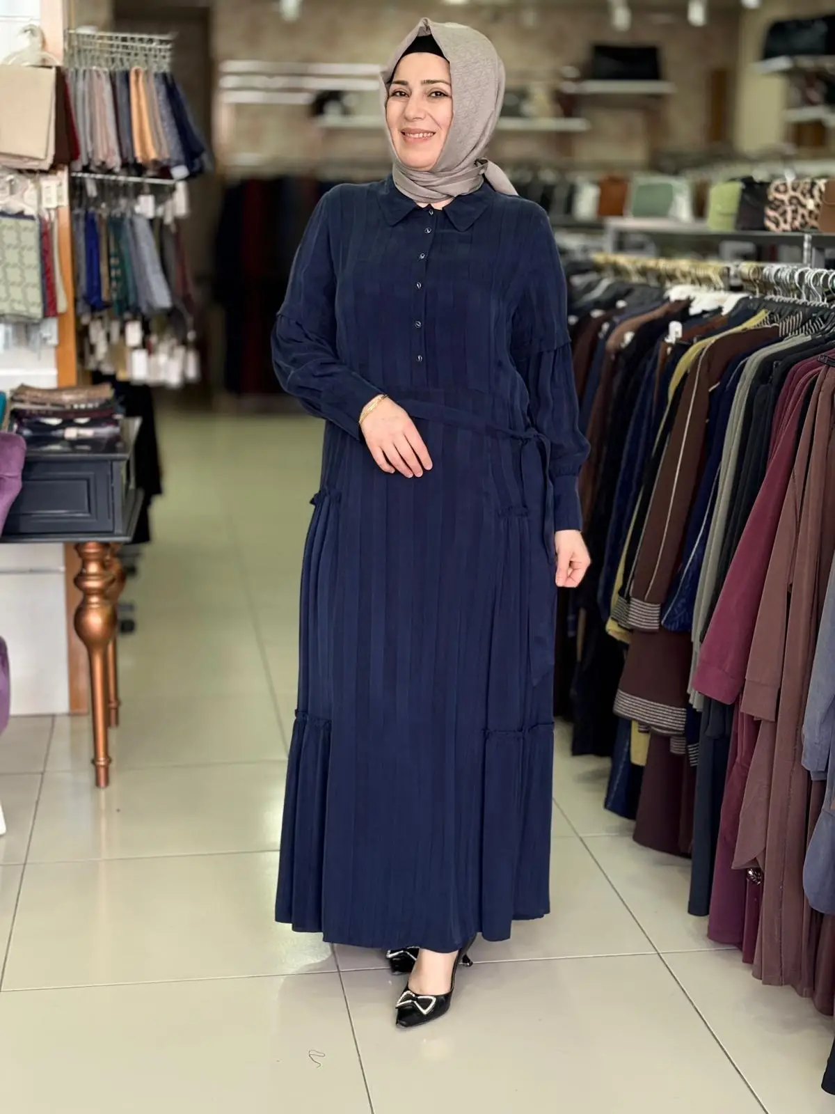 Merihce Tekstil olarak sizlere sunduğumuz DEFRİNA DÜĞMELİ FIRFIRLI CUPRO ELBİSE LACİVERT, kaliteli malzemelerden üretilmiş olup, şıklığı ve rahatlığı bir araya getiriyor. Giyim tercihlerinizi tamamlayacak bu özel tasarım, her ortamda zarif bir görünüm sunmanızı sağlar.