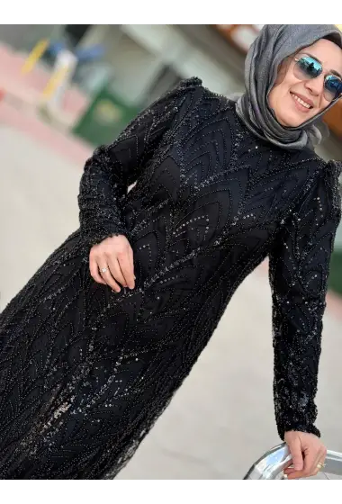 DULE İPEK KUPRA OMZU TAŞLI ELBİSE SİYAH