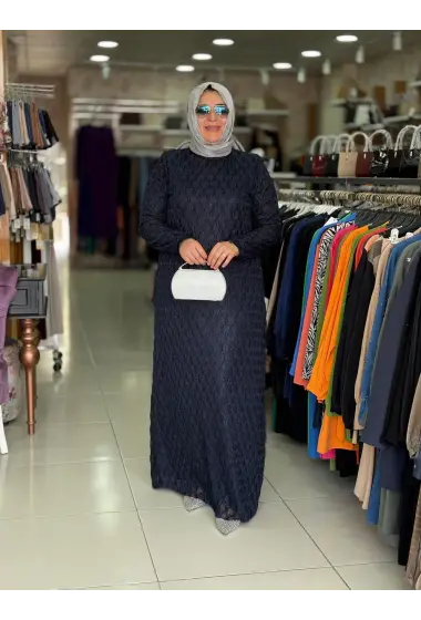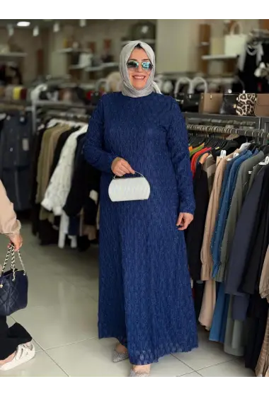 JUKİ EL İŞLEMELİ BONCUK DETAYLI ELBİSE LACİVERT