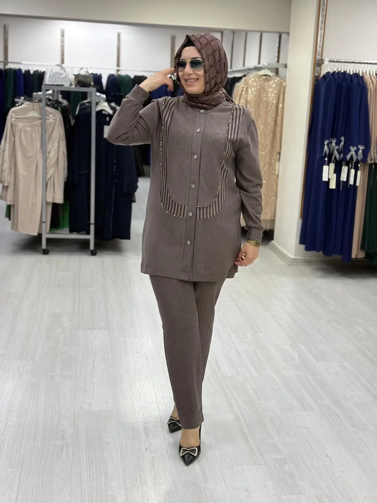 MEVA PLUS ÇİZGİLİ BAMBU MODAL TUNİK PANTOLON TAKIMI KAHVERENGİ