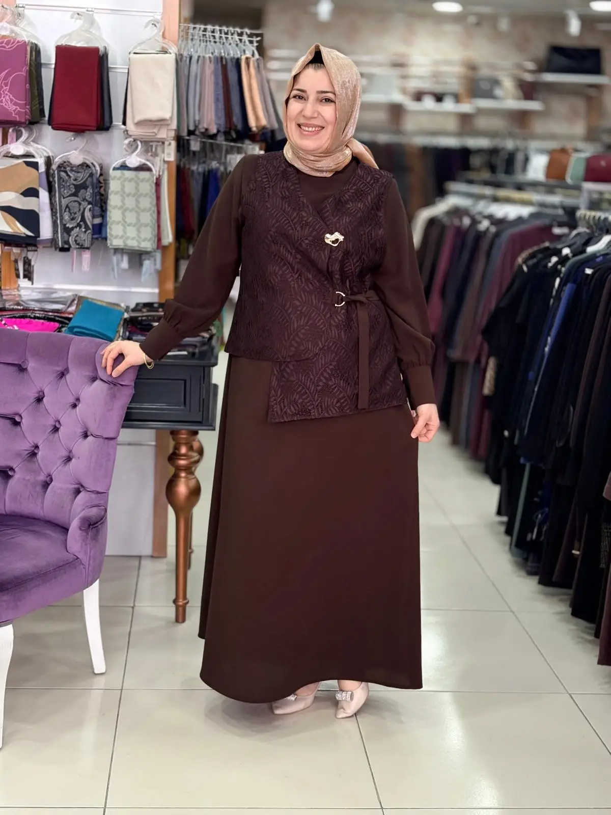 MEVAPLUS DANTEL YELEKLİ ELBİSE KAHVERENGİ